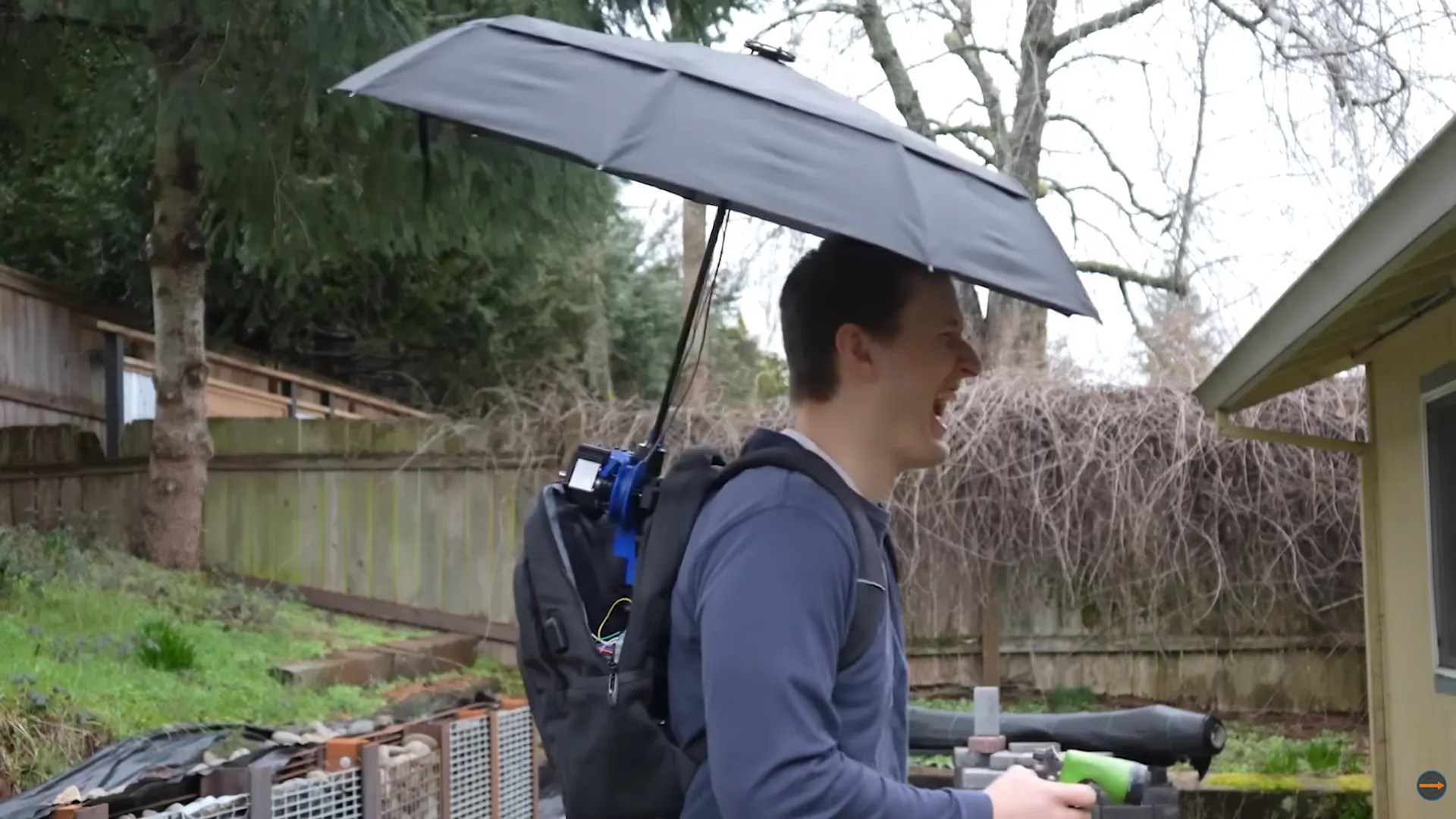 Not so fast, says YouTuber Current Concept. He has built a new kind of umbrella that pops out of a backpack to keep your hands free and your head dry. You don’t even have to open the umbrella yourself — when it detects raindrops, it pops open automatically.